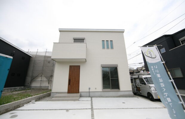 まず外観ですが、張り出した軒が分かりますでしょうか?こちらは南側ですが、軒を大きく前に出すことで、夏の強烈な日差しが壁や家の中に差し込まないよう、日陰を作ります。逆に冬は入射角が低いので、穏やかな日差しが壁や家の中を柔らかく温めてくれます。