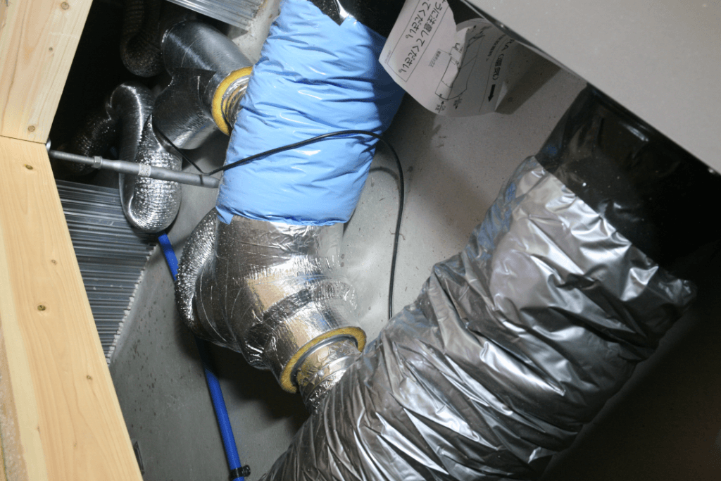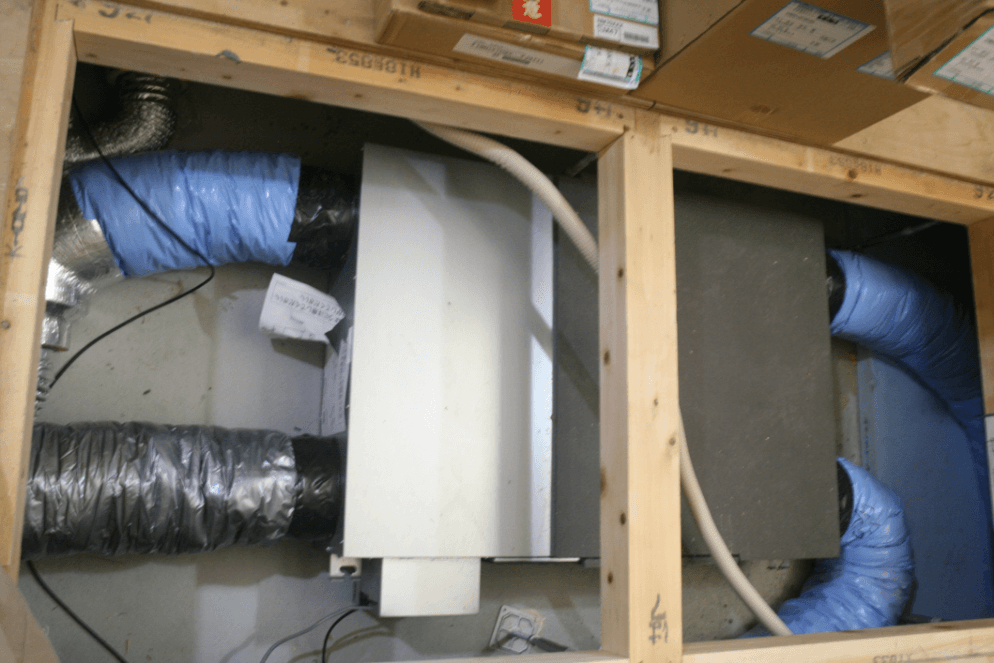 こちらは1階の床下に格納されたエクリア装置です。こちらは標準のダクトレス熱交換器システムとはちがい、オプションです。