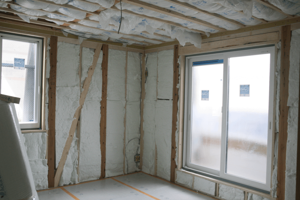 次に2階の様子です。ぴっちりと断熱材が詰め込まれていますね。また、壁材、屋根材はもちろんのこと、窓ガラスの大きさや断熱性能も、家の断熱等級に関わる重要な要素です。