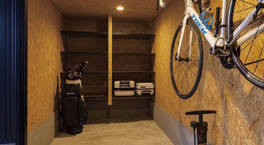 自転車やアウトドア用品、ガーデニング道具をそのまま置けるスペースは、収納と動線を兼ね備えた多目的ゾーンとして活躍します。
